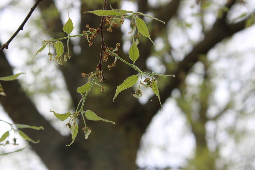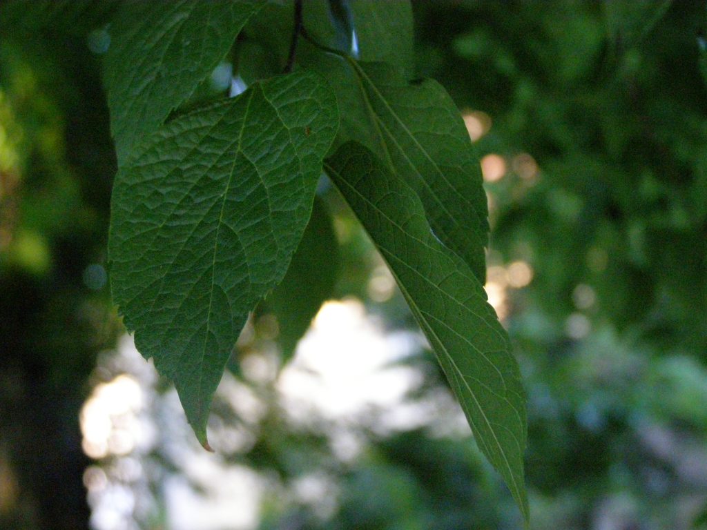 List: Řapíkaté listy vyrůstají na větvích střídavě. Jejich čepel je vejčitá, dlouhá až 12 cm a má asymetrickou bázi a vrcholovou špičku. Okraj je pilovitý. Svrchní strana je drsná a lysá, spodní na žilkách chlupatá.
