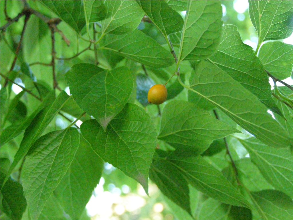 Květ, plod: Kvete v březnu až květnu světle zelenými květy vyrůstajícími v úžlabí horních listů. Plodem je kulatá oranžová až tmavě modrá peckovice o průměru až 2 cm.