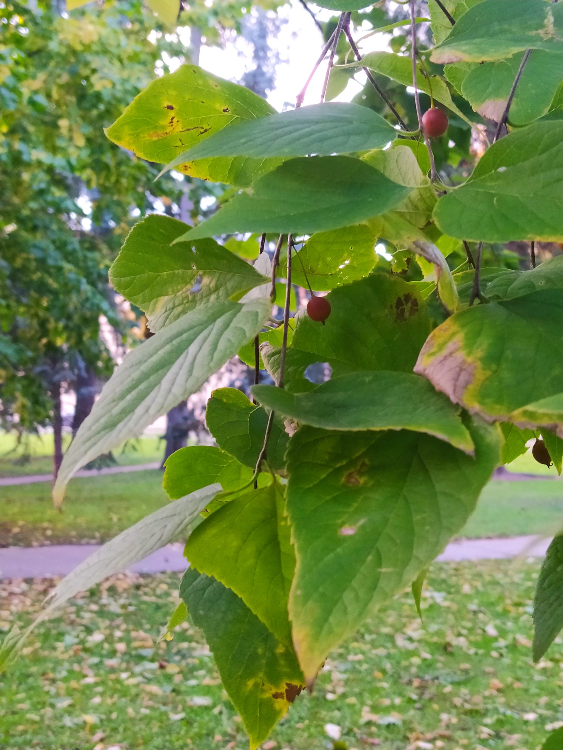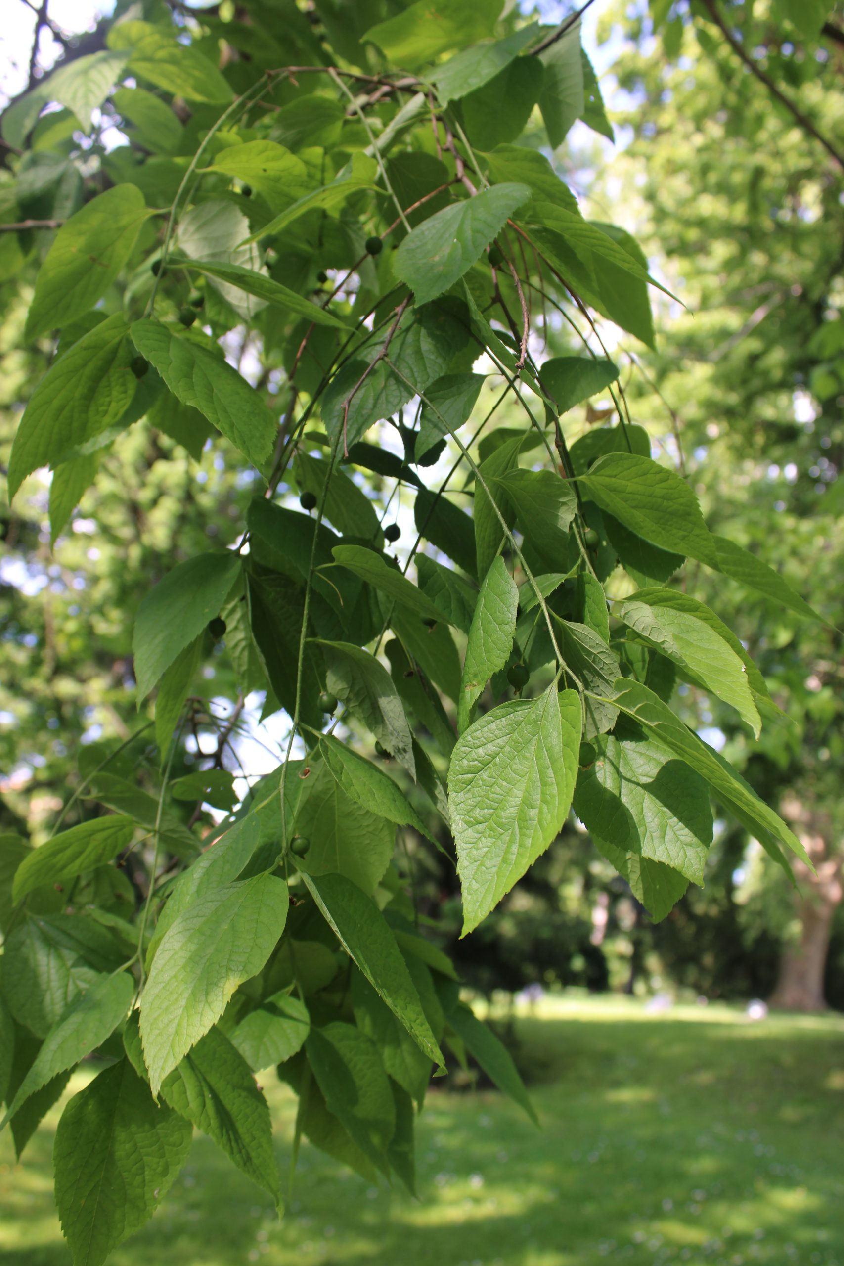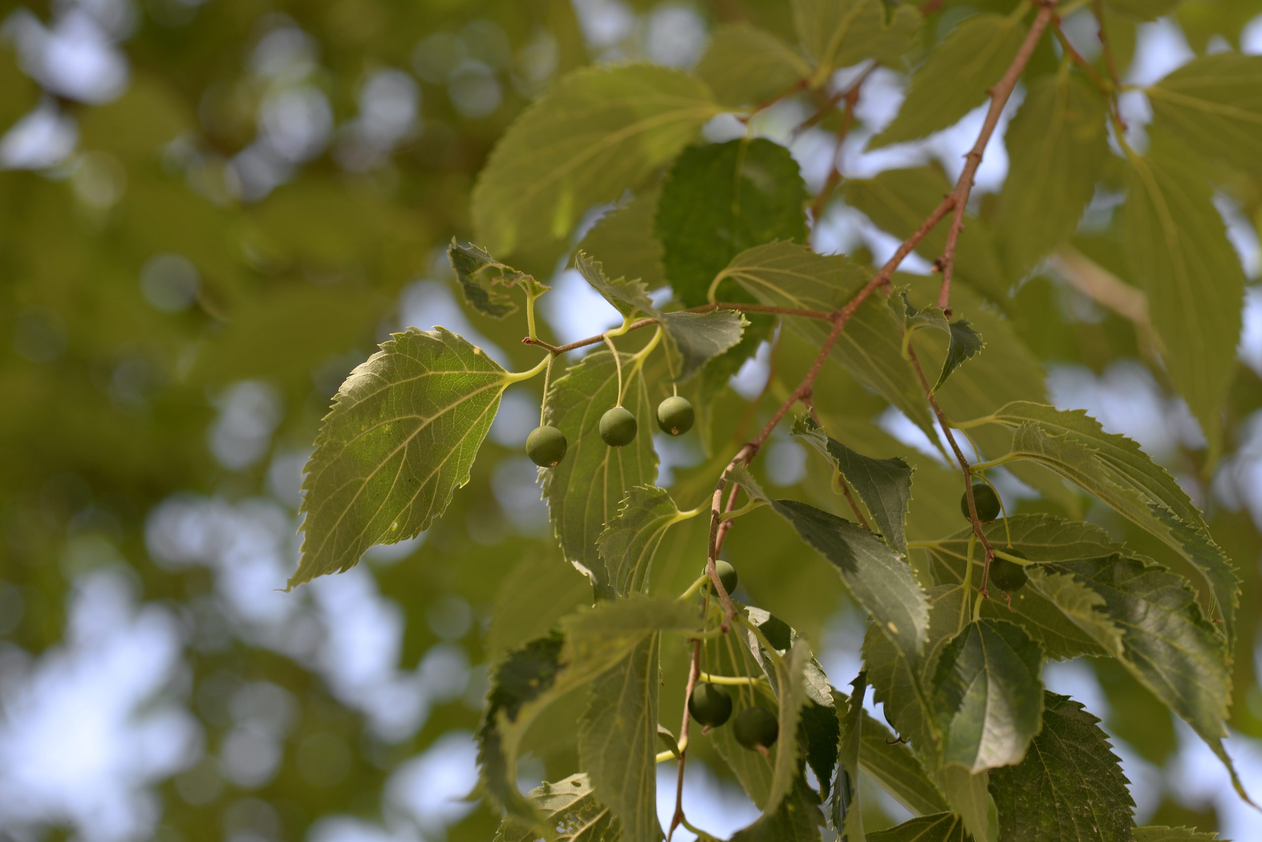 List: Řapíkaté listy vyrůstají na větvích střídavě. Jejich čepel je vejčitá, dlouhá až 12 cm a má asymetrickou bázi a vrcholovou špičku. Okraj je pilovitý. Svrchní strana je drsná a lysá, spodní na žilkách chlupatá.