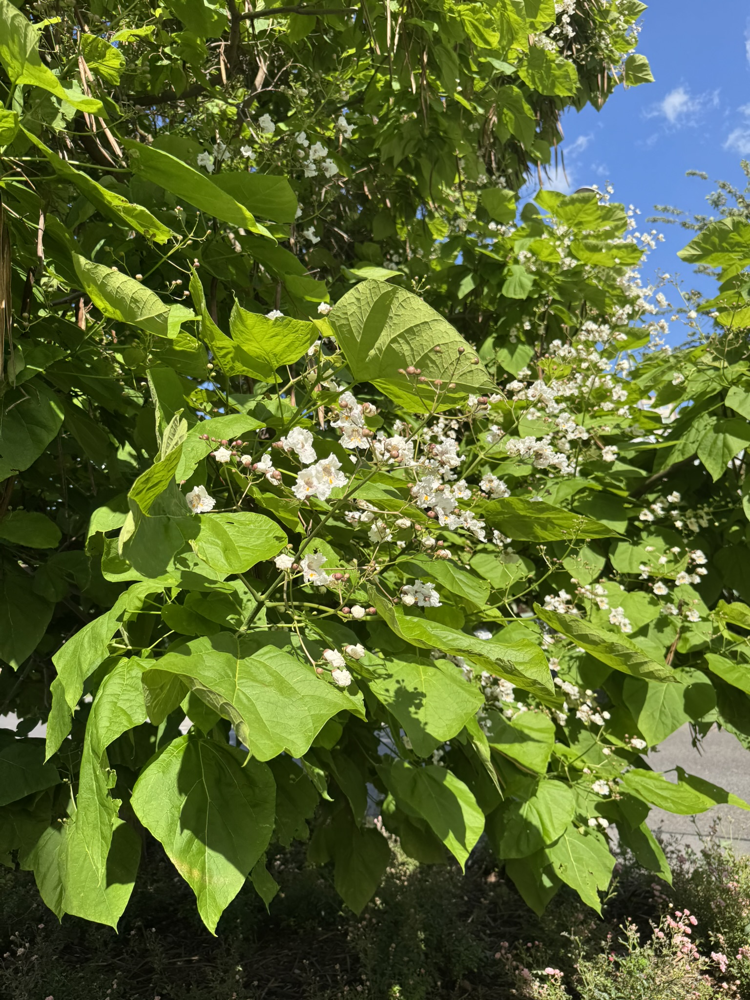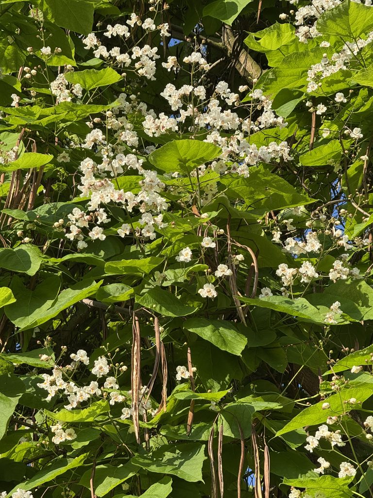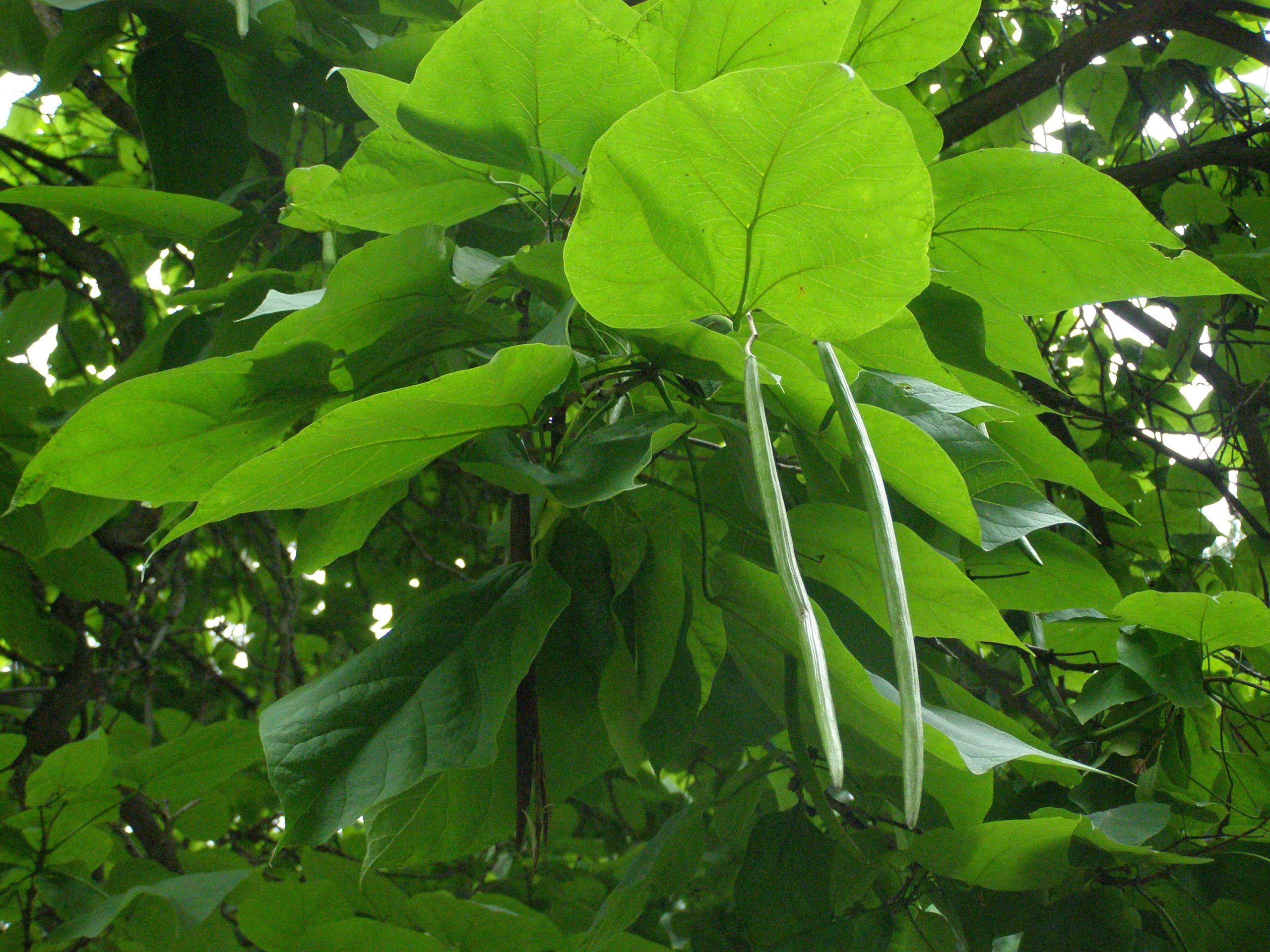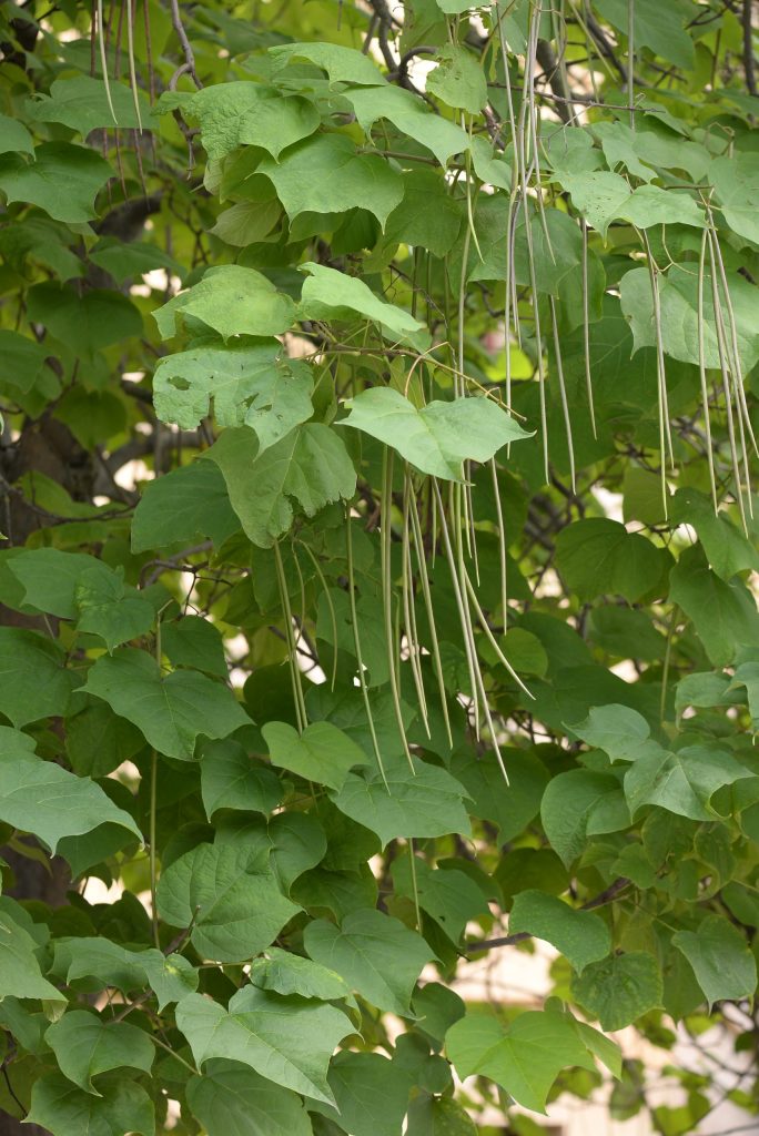 Bloom, fruit: It blooms from June to July with abundant panicles of white blossoms with purple-yellow tinge. The fruits are up to 45 cm long, narrow, brown capsules containing a number of small, elongated, fluffy seeds.