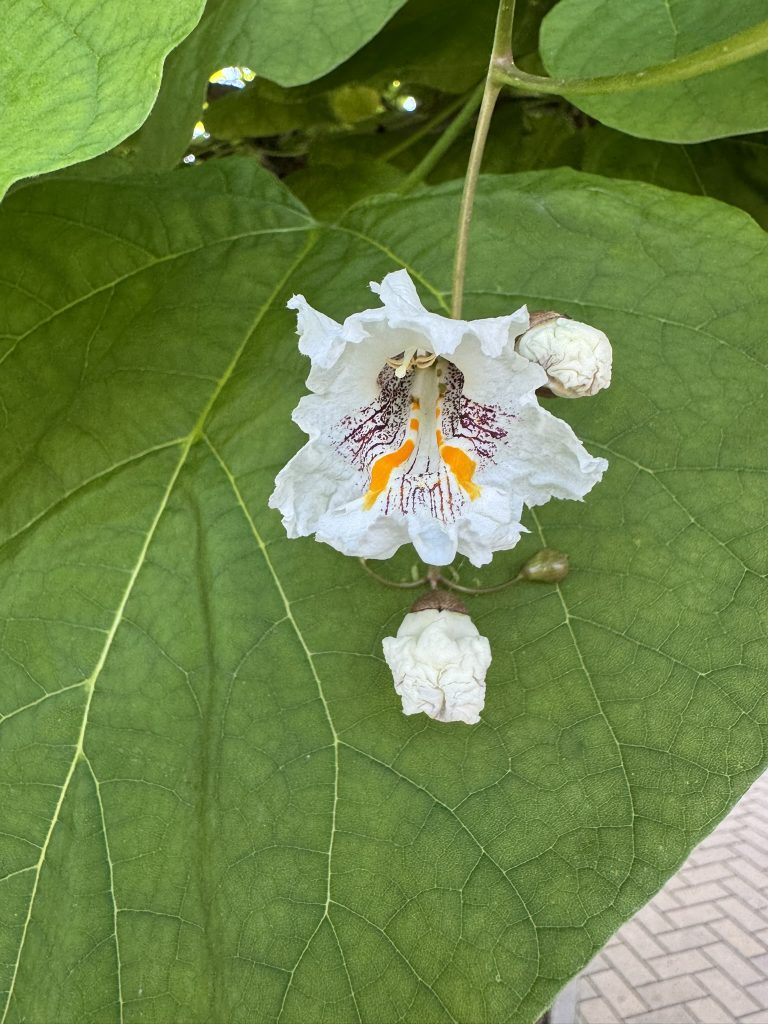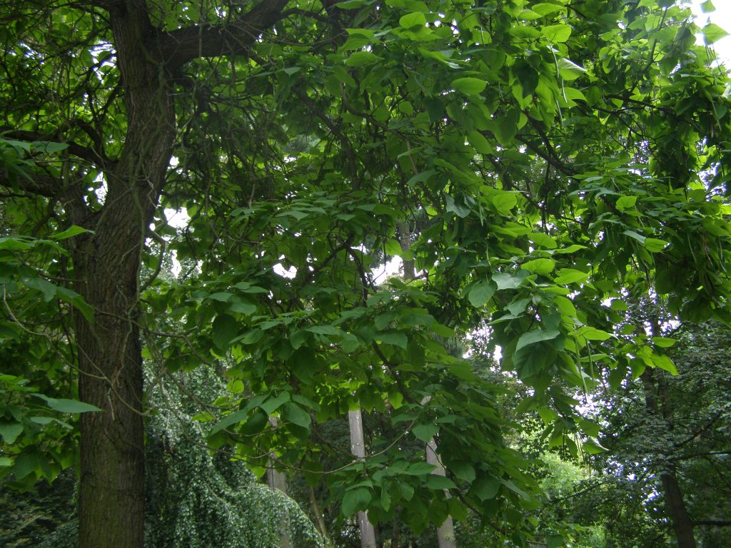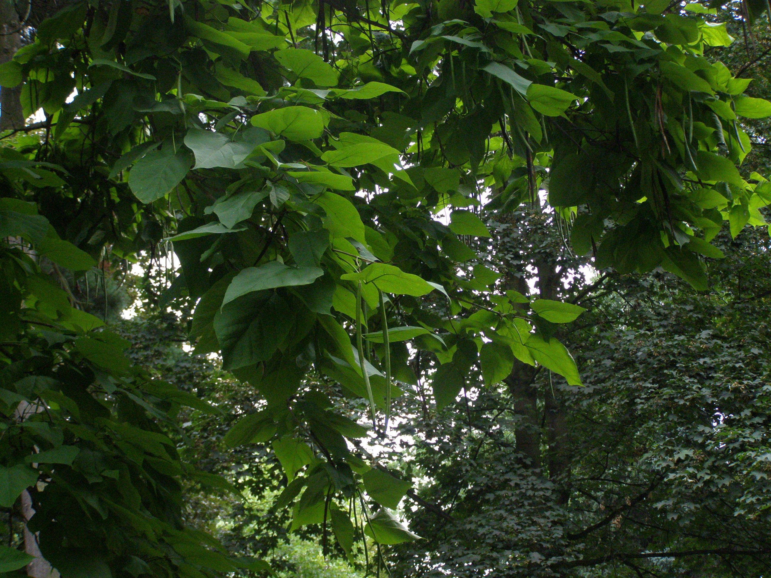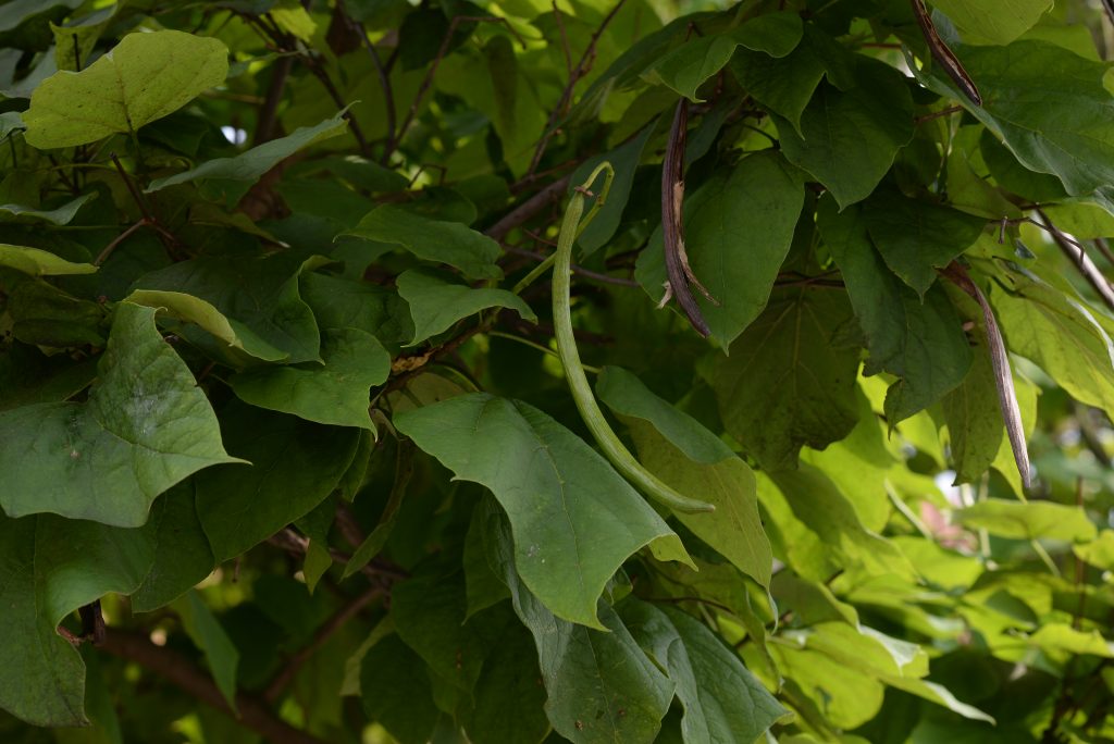 Leaf: Long petiolate leaves grow oppositely on the branches. Their blade is up to 22 centimetres long and 20 centimetres wide, it is ovate with a cordate base. The reverse side is covered with trichomes (that is why it is lighter than the upper side). The leaves badly smell when crushed.