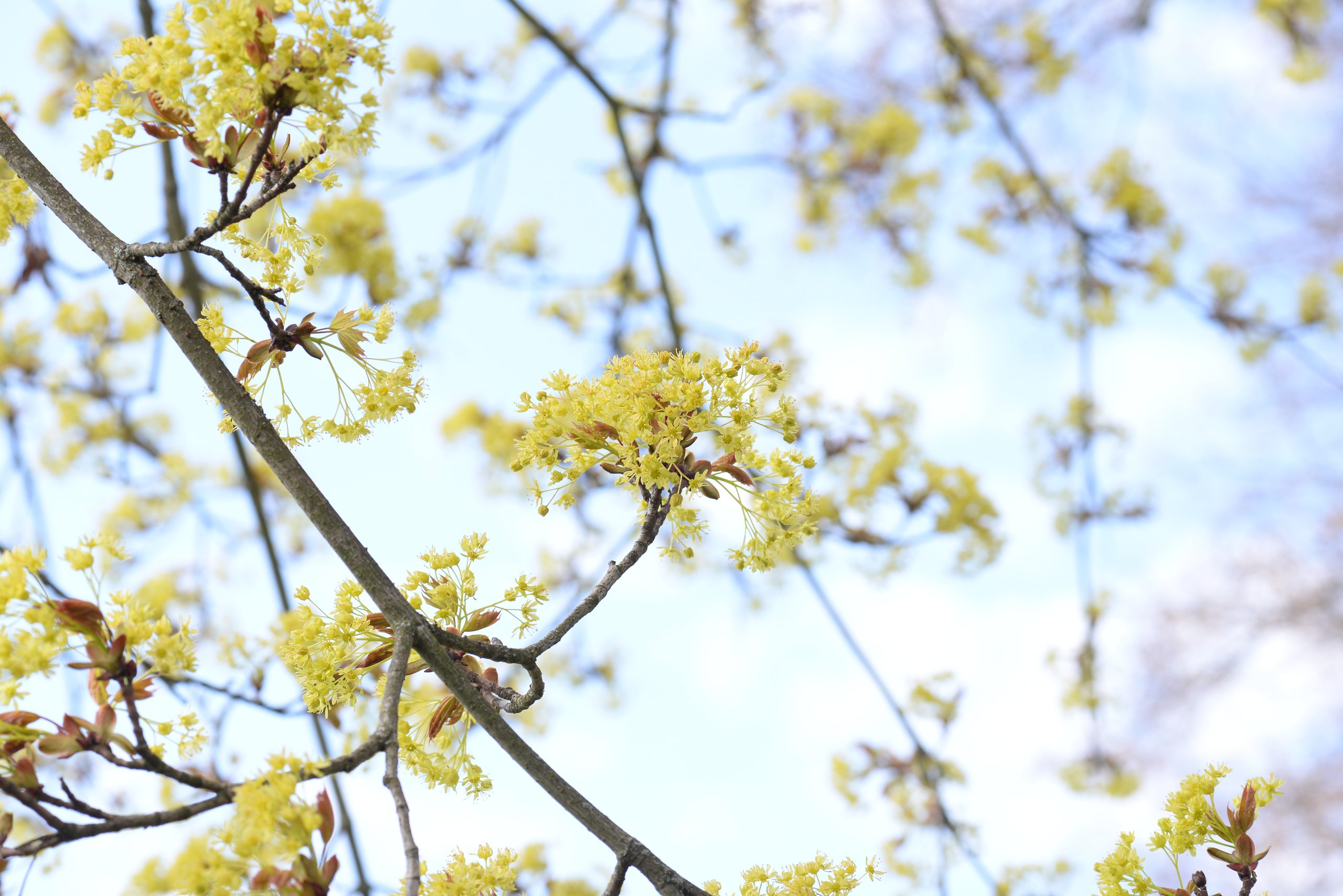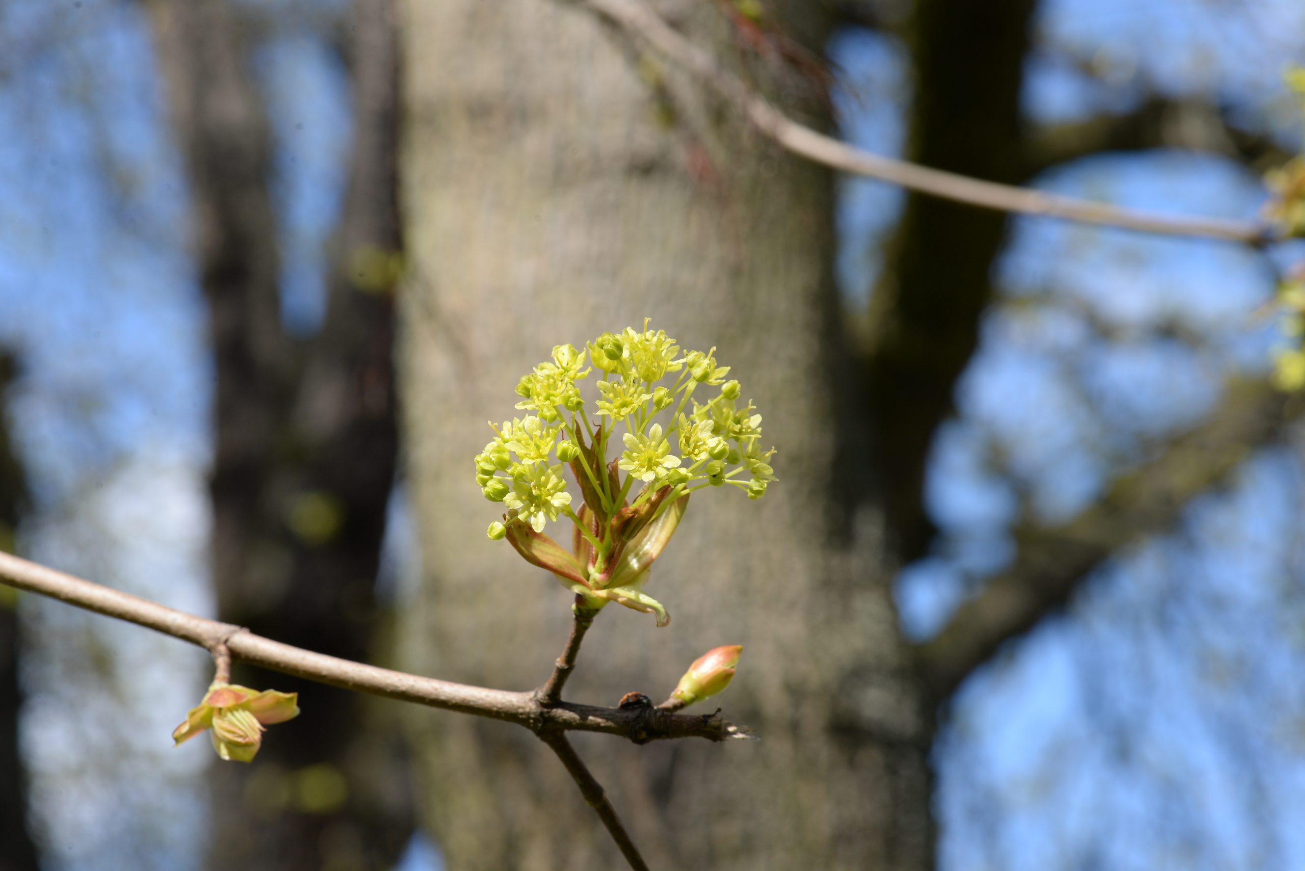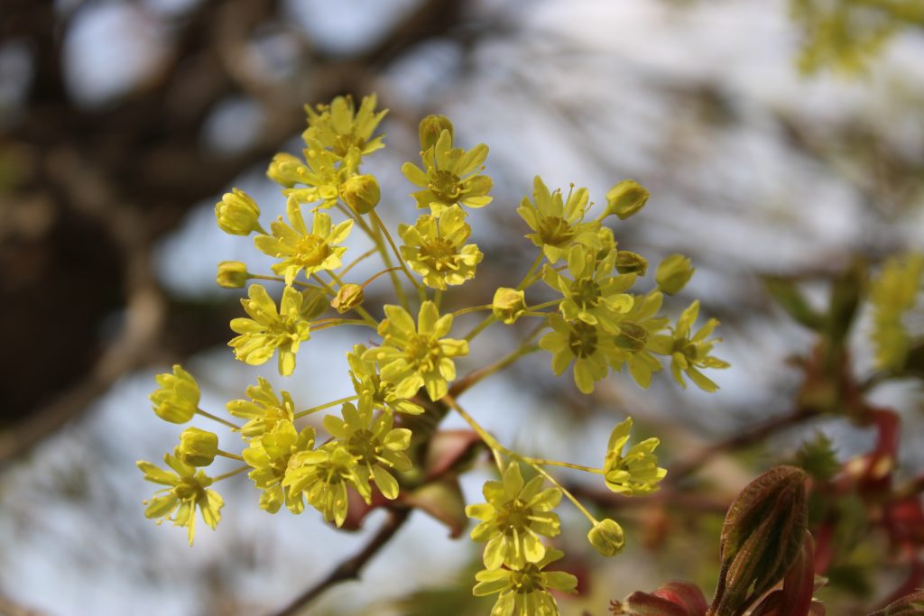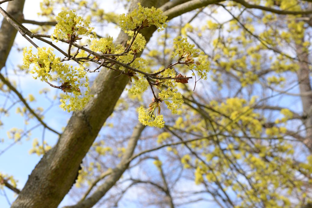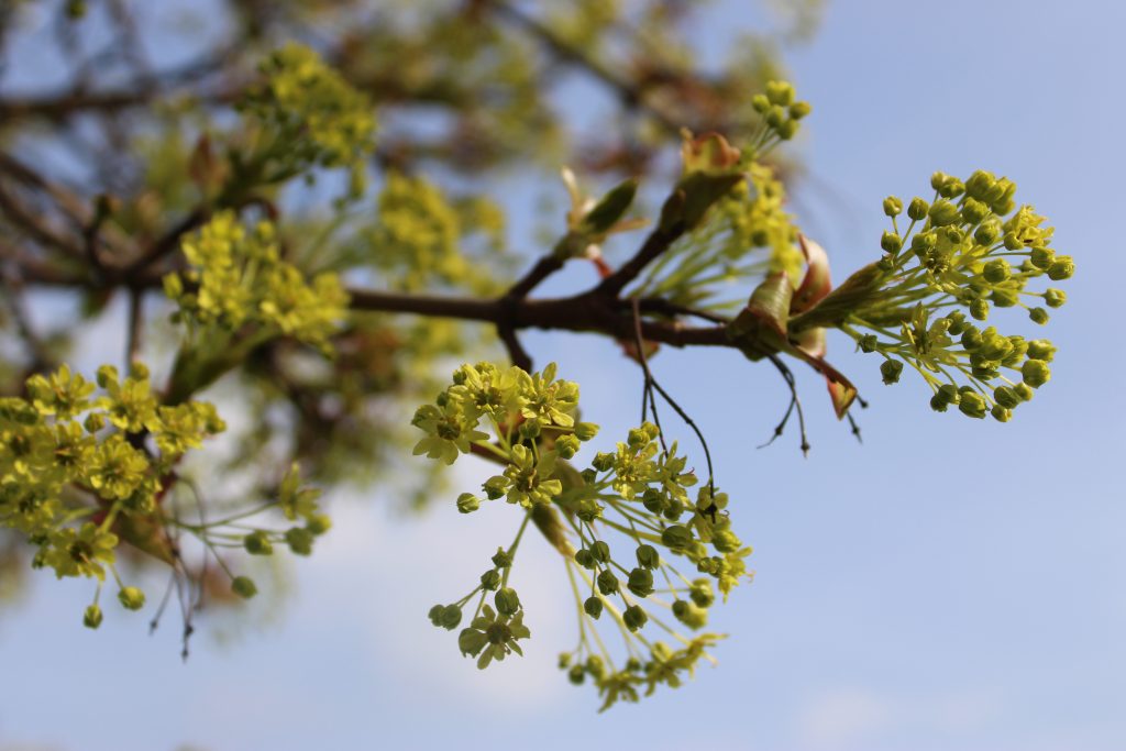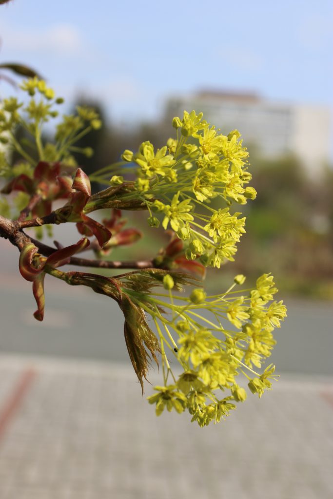 Bloom, fruit: It blooms from April to May with yellow-green, small, inconspicuous blossoms arranged in hanging clusters. The fruit is a winged dioecious achene up to 5 centimetres long forming an acute angle.