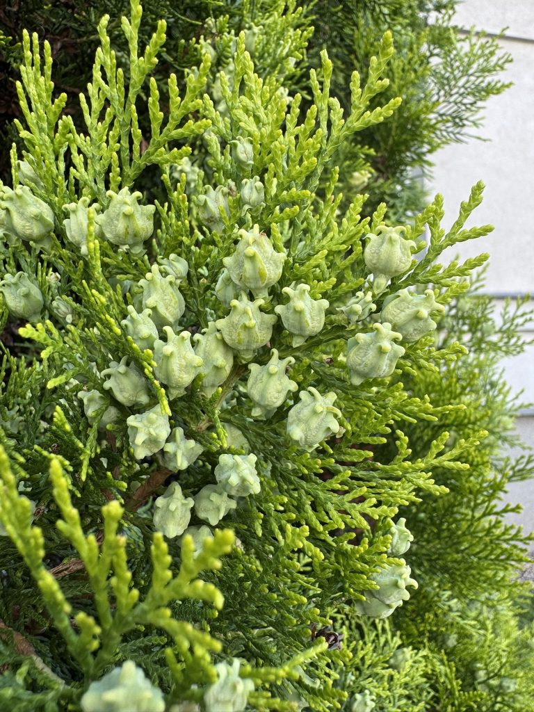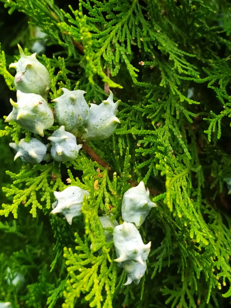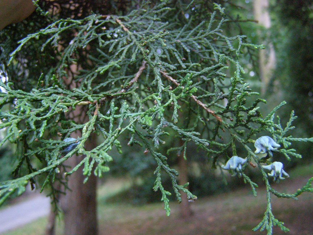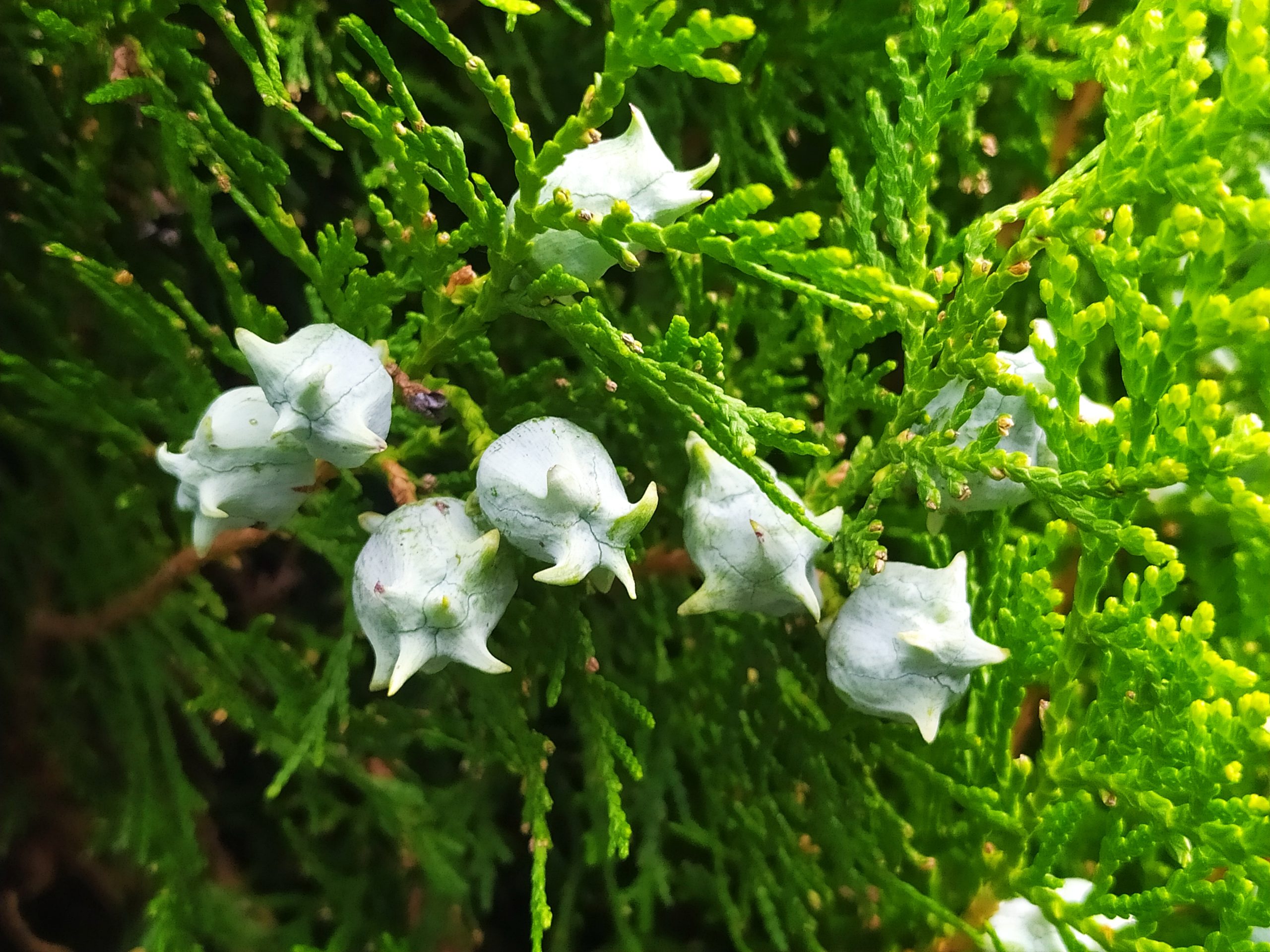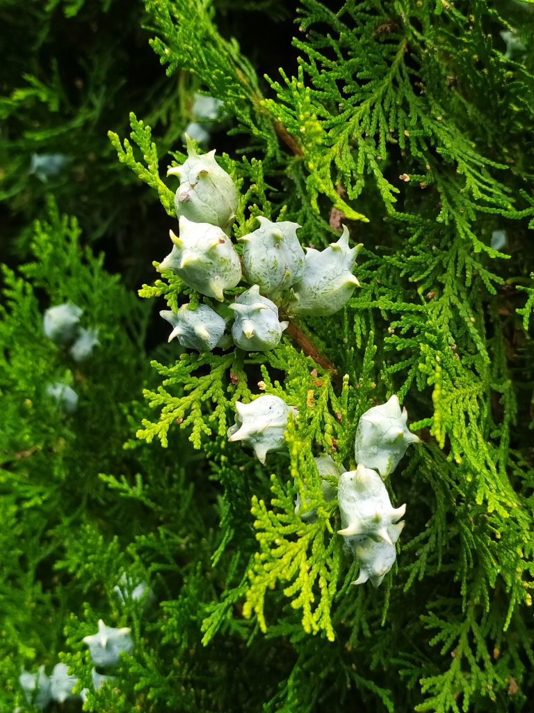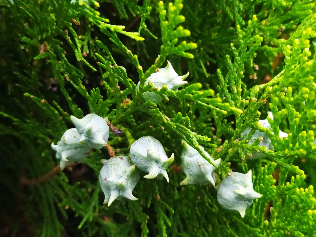 Bloom, fruit: Male cones are yellow, female ones have a more striking bluish colour. Ripening cones are light green and frosty on the surface. They are formed by 3–4 pairs of seed scales. These are thickened and elongated into a hooked protrusion at the end. Mature cones get woody.