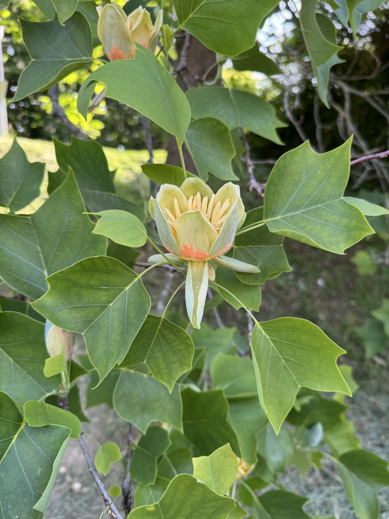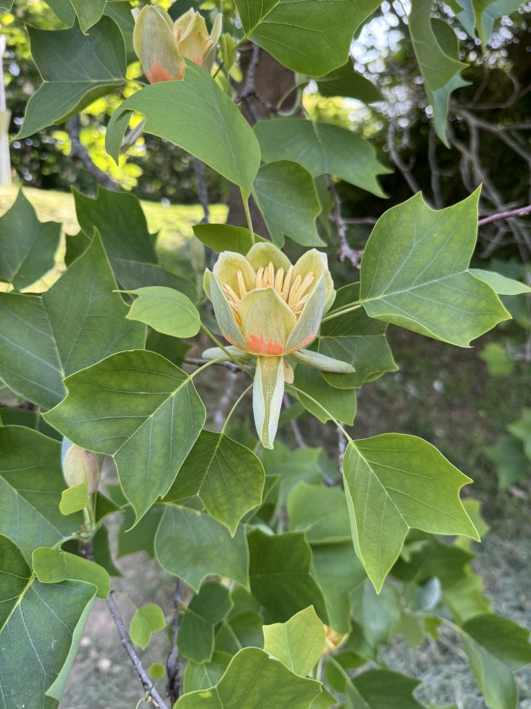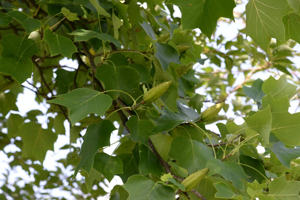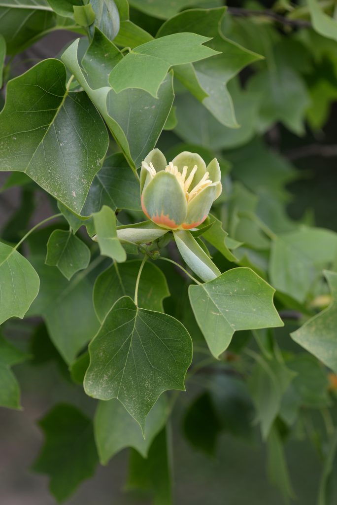Bloom, fruit: It blooms from May to June. The blooms resemble tulip flowers, are bell-shaped and up to 6 centimetres long, composed of 3 green calyx and 6 yellow corolla petals with an orange stripe. The fruits are winged achenes stored in a cone.