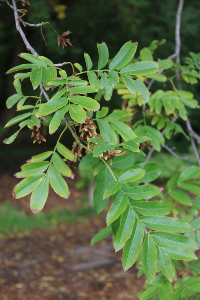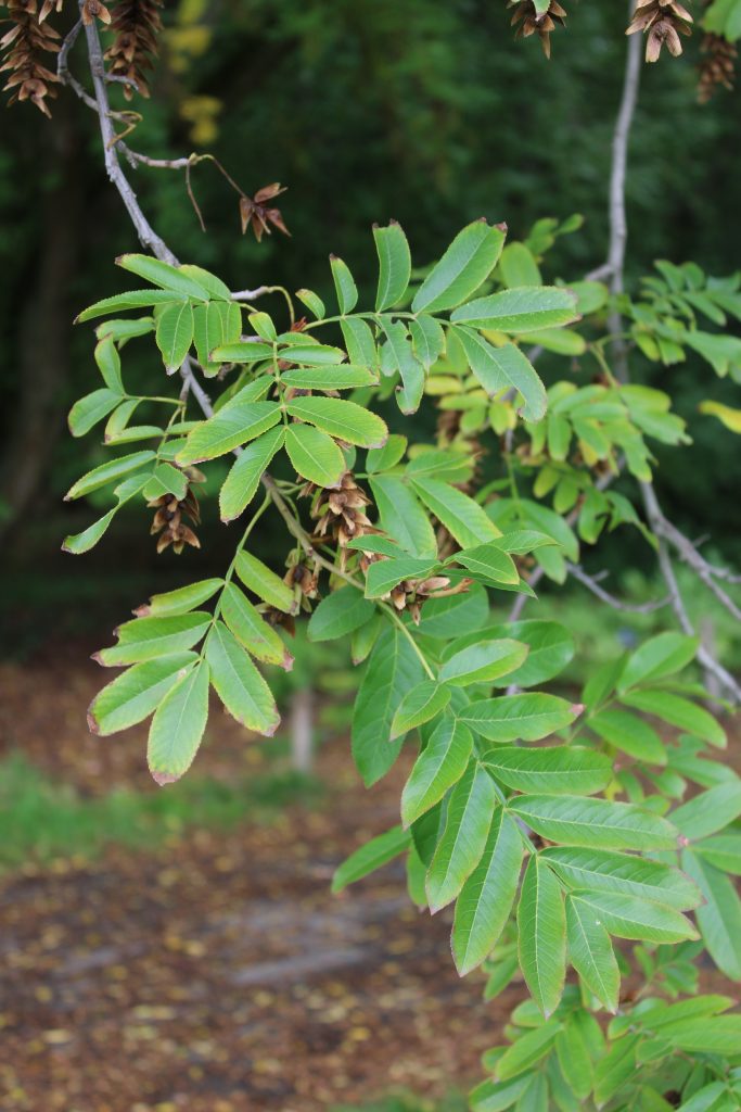 List: Listy jsou složené z 11–25 lístků s pilovitým okrajem. Jsou v horní třetině rozšířené a při bázi asymetrické.