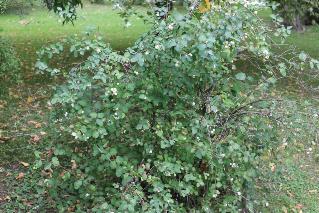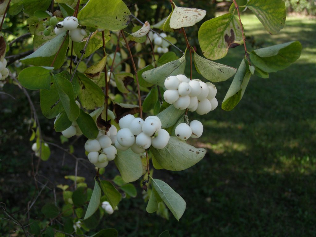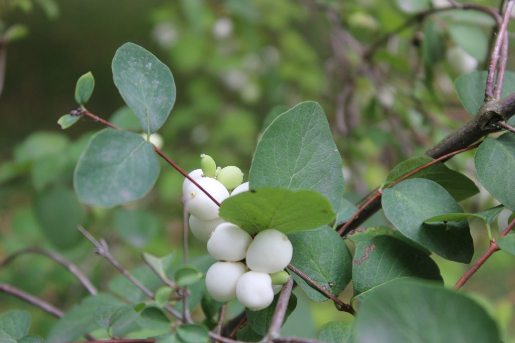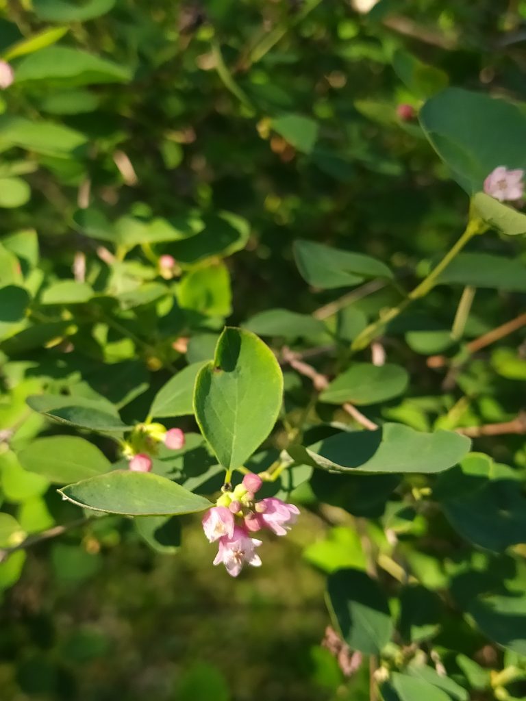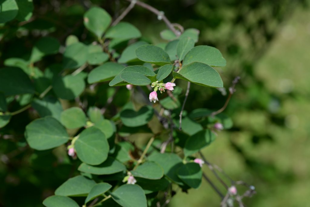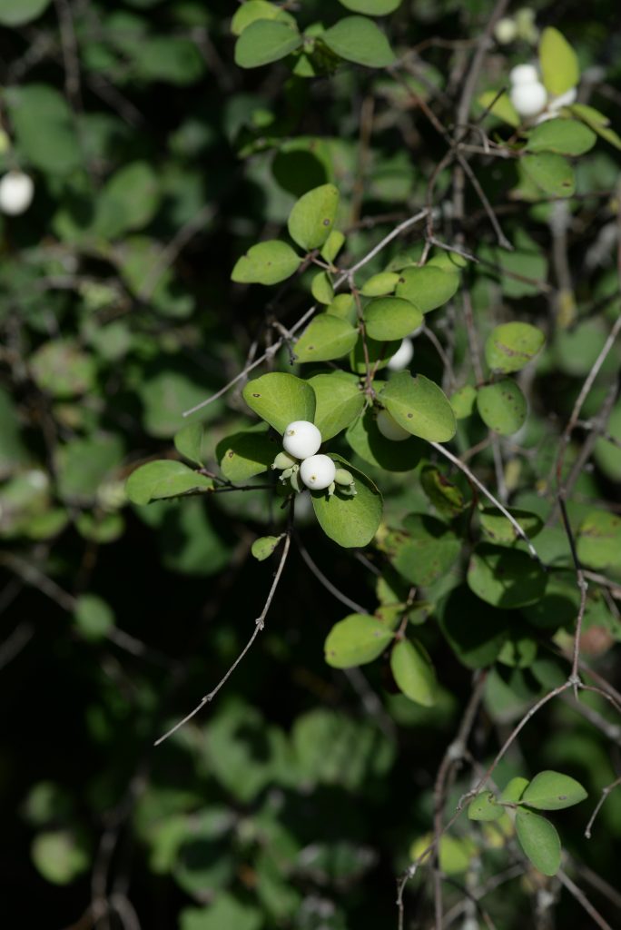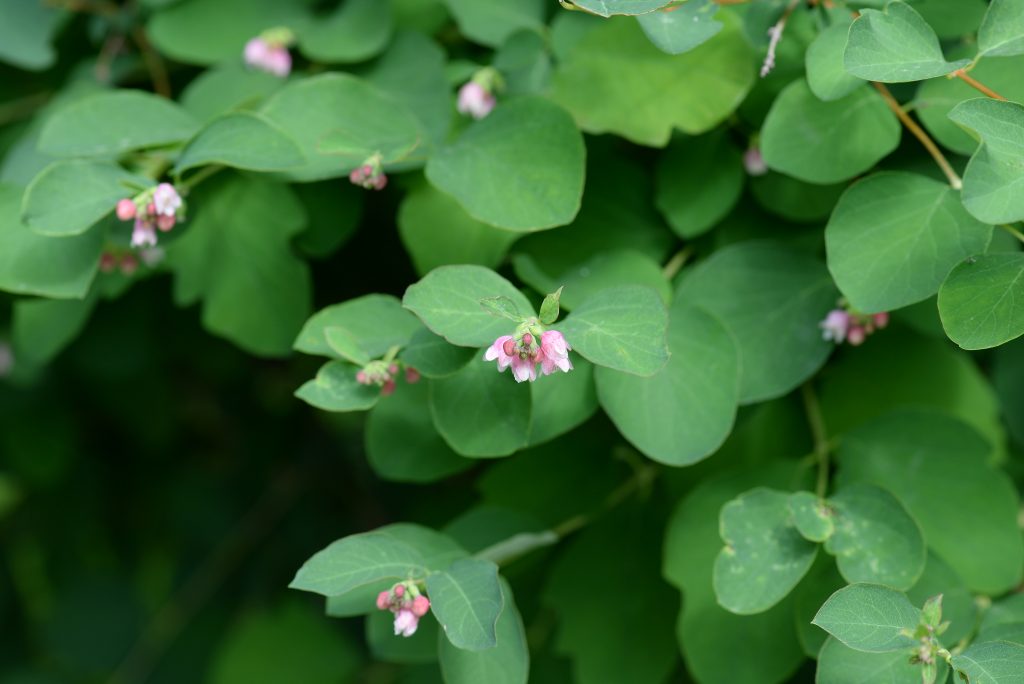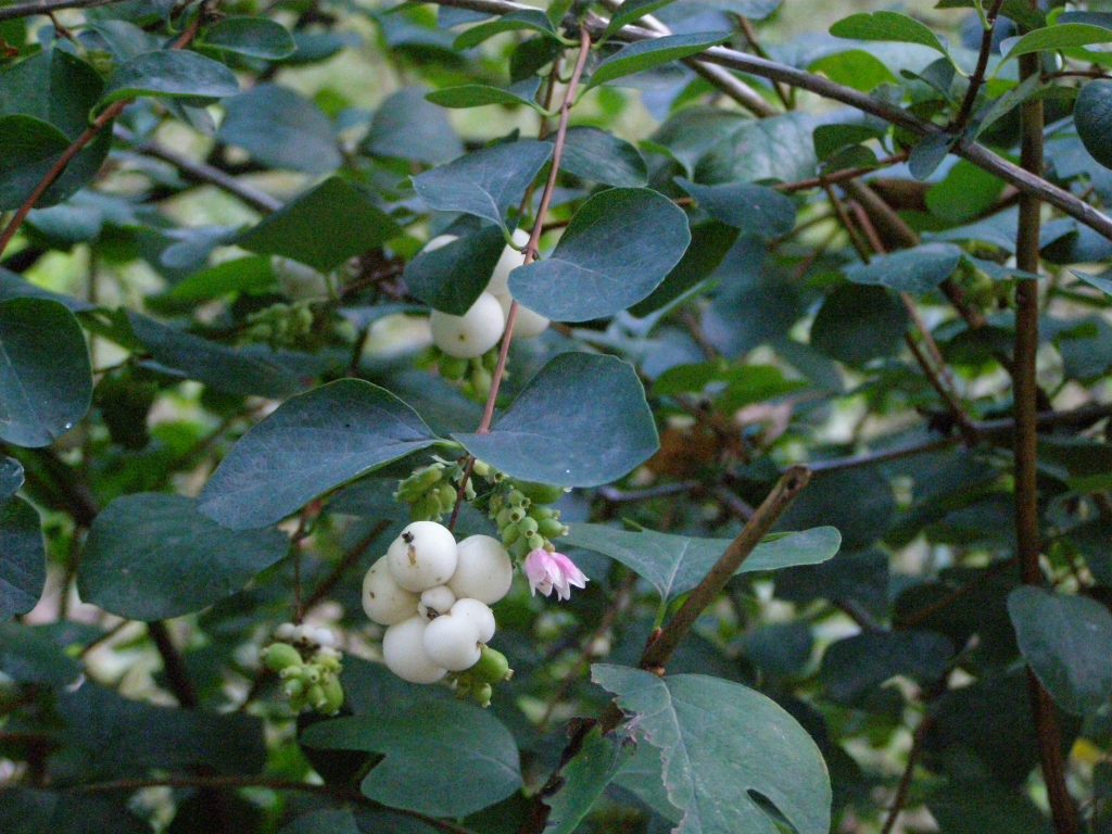 Květ, plod: Kvete od června do srpna bílo-růžovými drobnými trubkovitě zvonkovitými květy, které vyrůstají v úžlabí horních listů v hroznech a produkují velké množství nektaru. Plodem jsou velké kulaté bílé bobule o průměru 1 cm, které obsahují 2 semena. Na keři vytrvávají až do zimy, kdy slouží jako potrava ptáků.