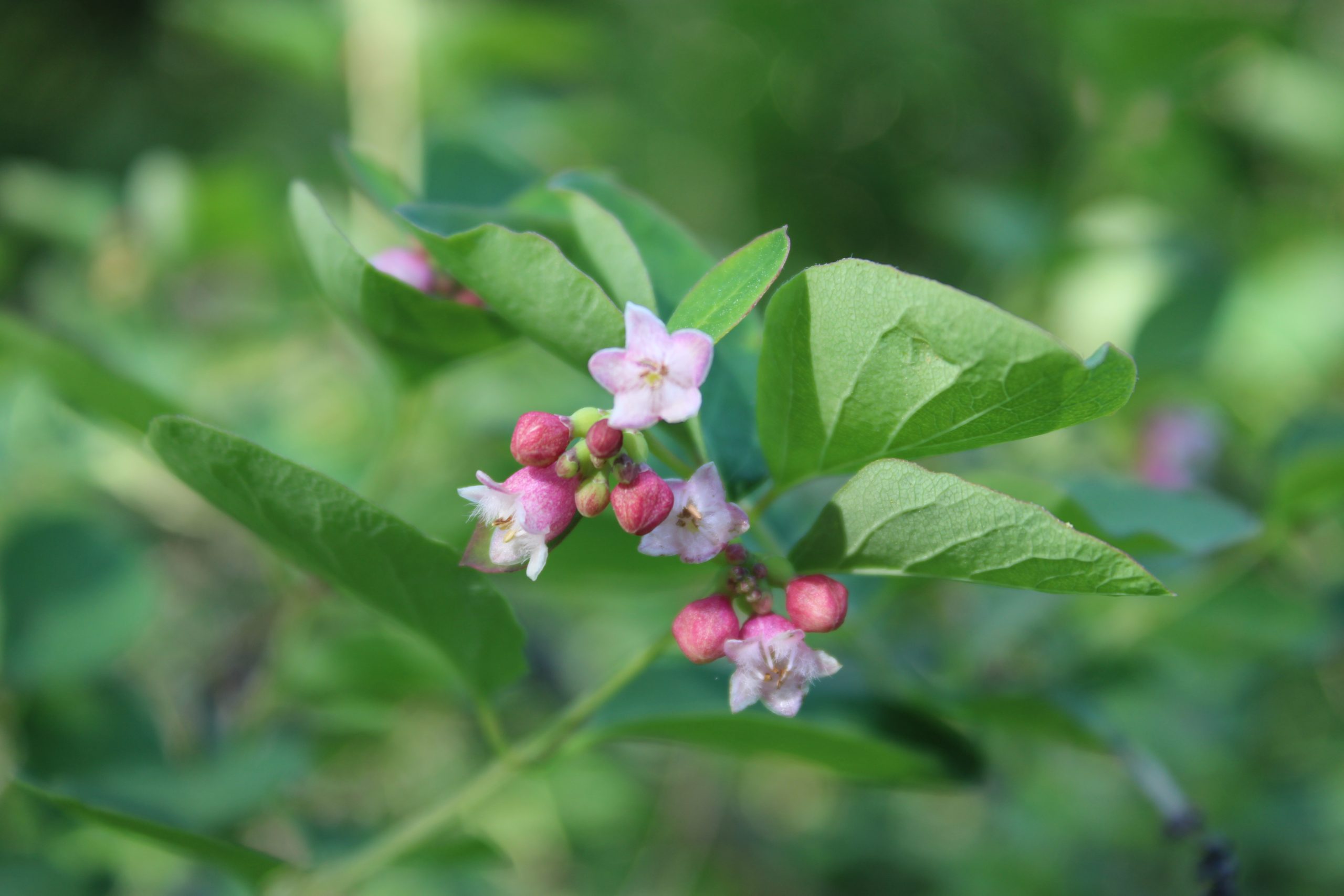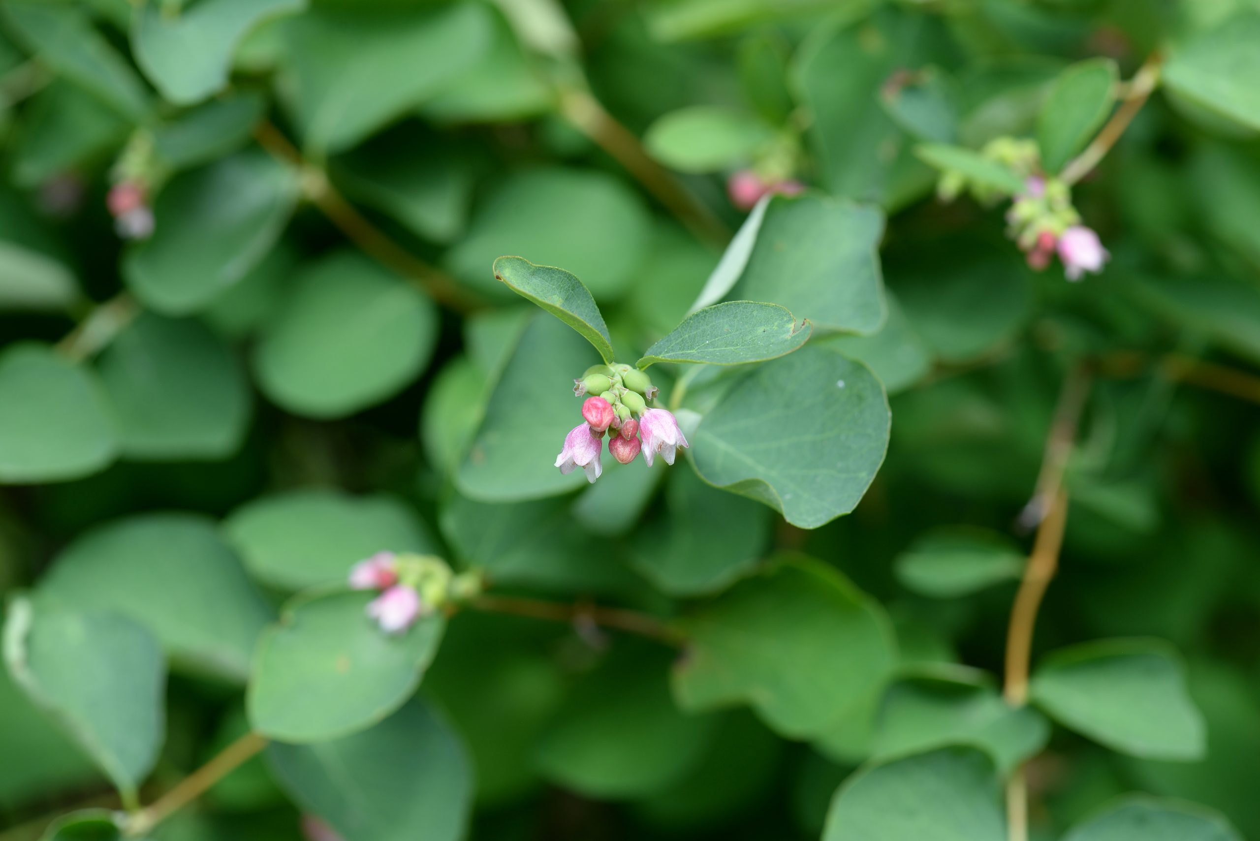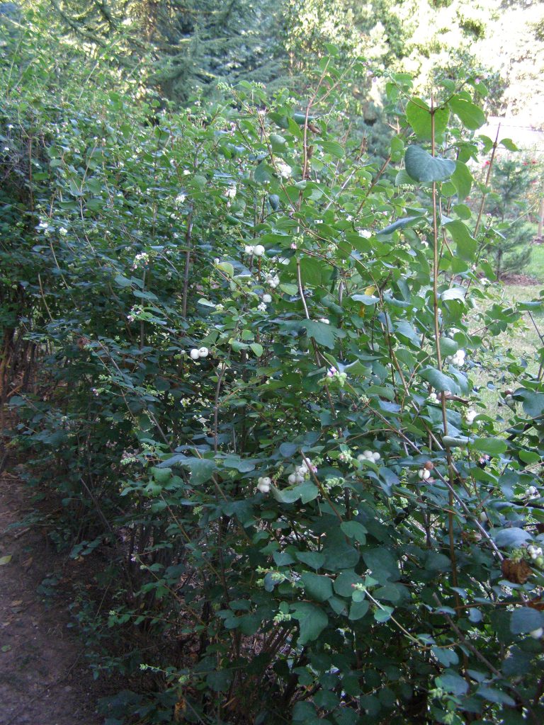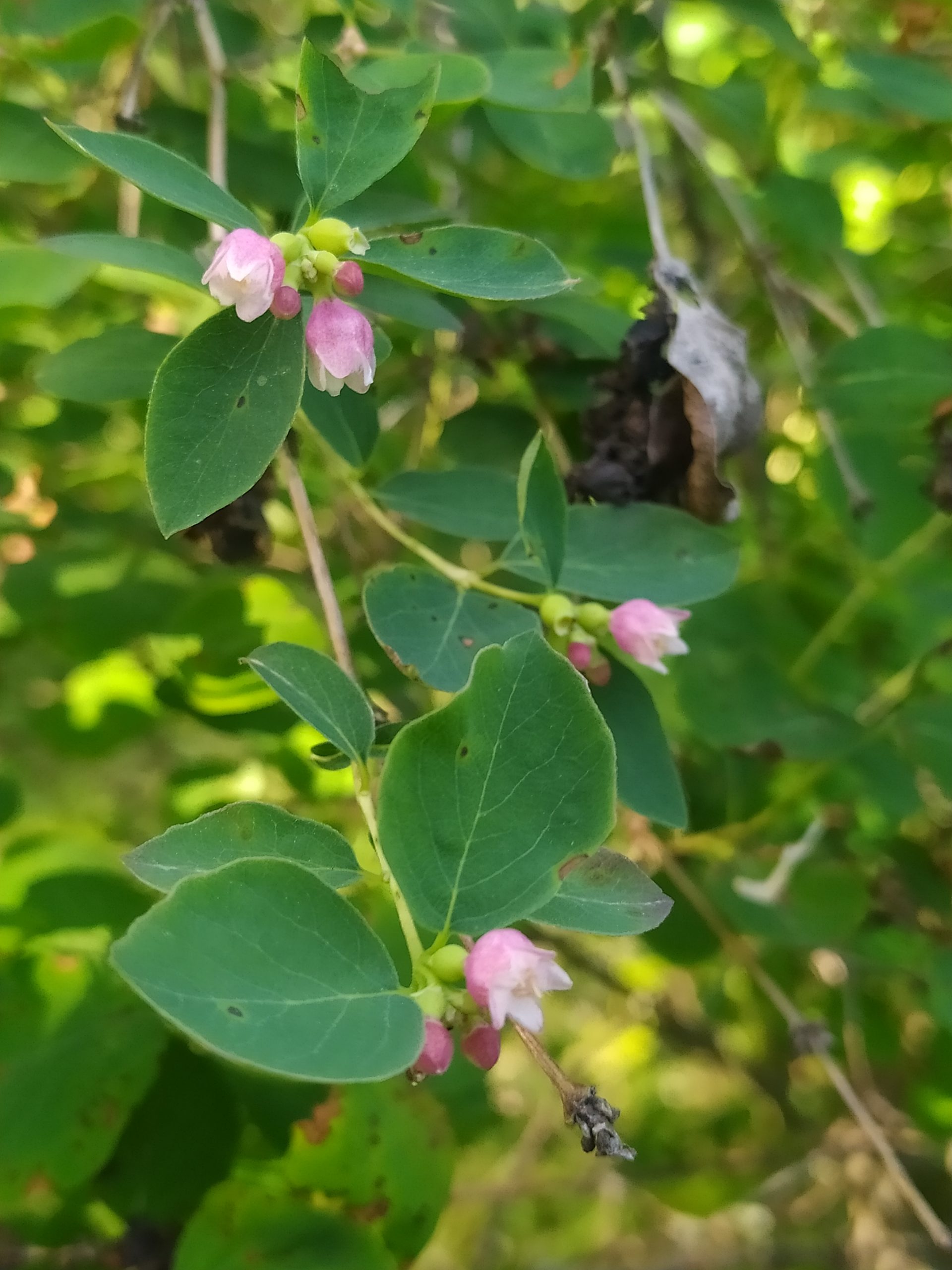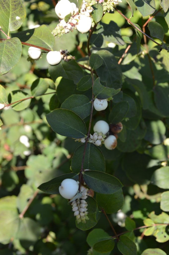 Květ, plod: Kvete od června do srpna bílo-růžovými drobnými trubkovitě zvonkovitými květy, které vyrůstají v úžlabí horních listů v hroznech a produkují velké množství nektaru. Plodem jsou velké kulaté bílé bobule o průměru 1 cm, které obsahují 2 semena. Na keři vytrvávají až do zimy, kdy slouží jako potrava ptáků.