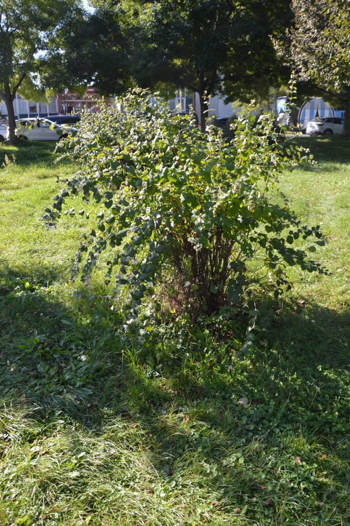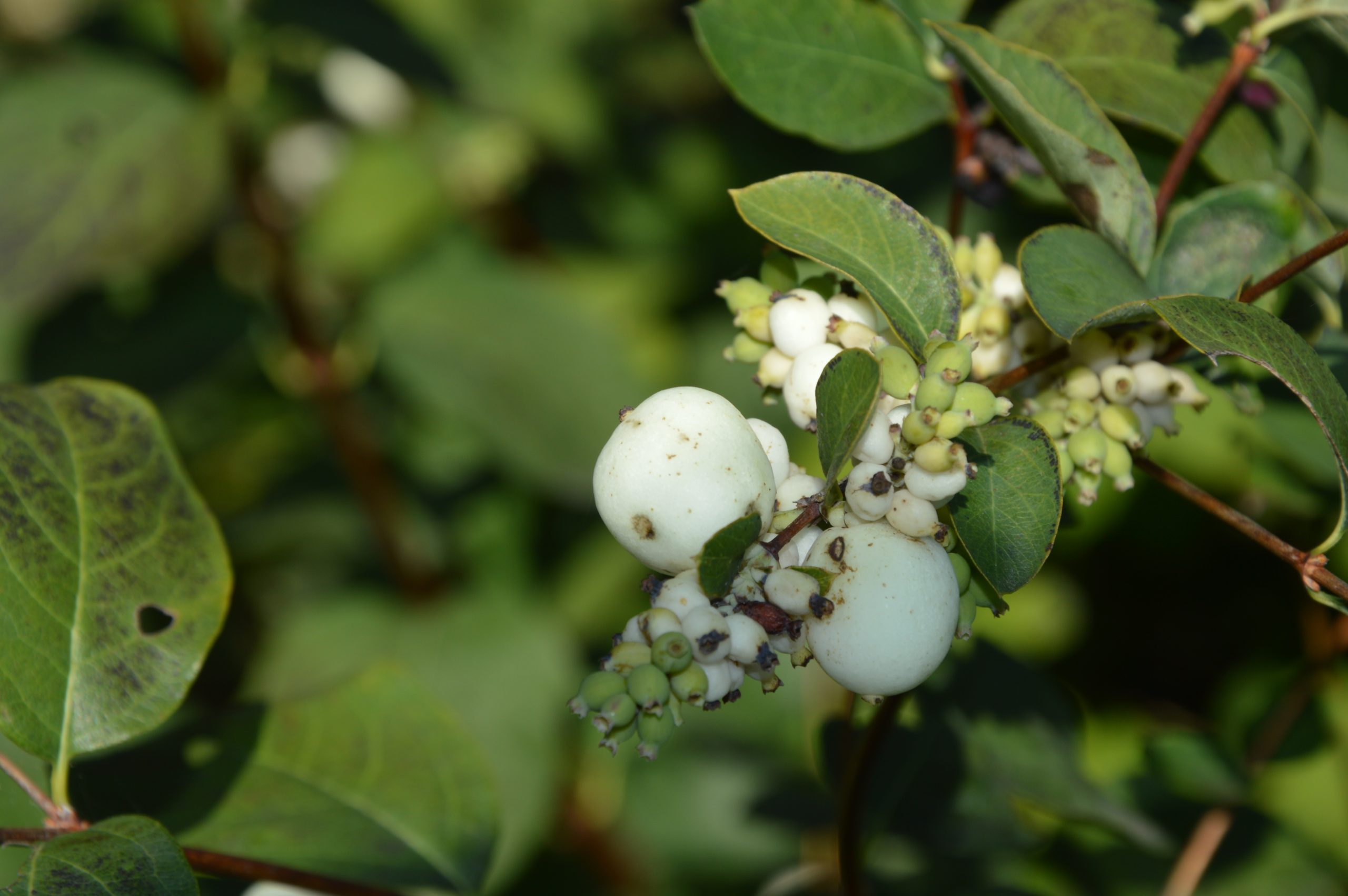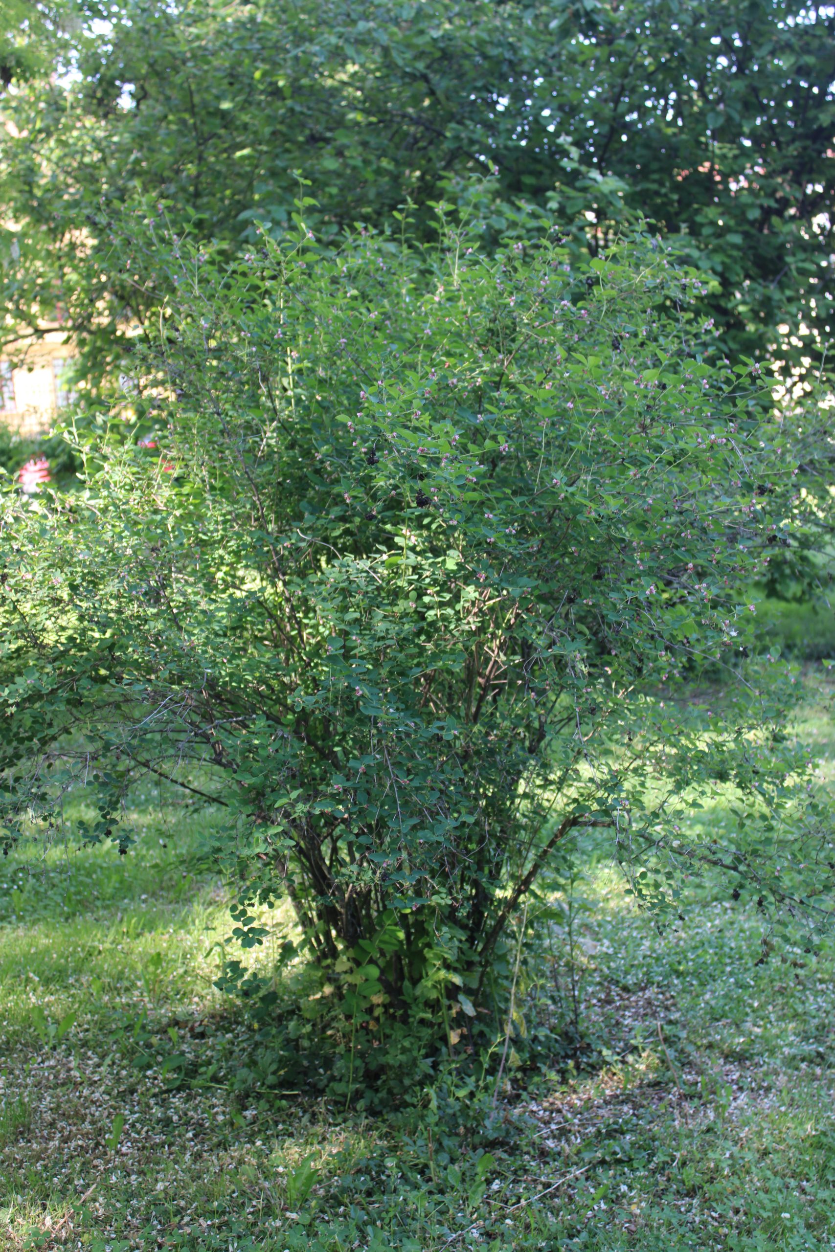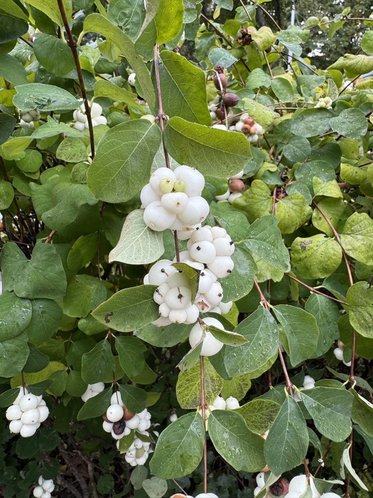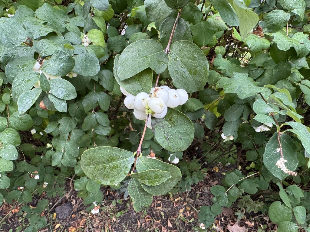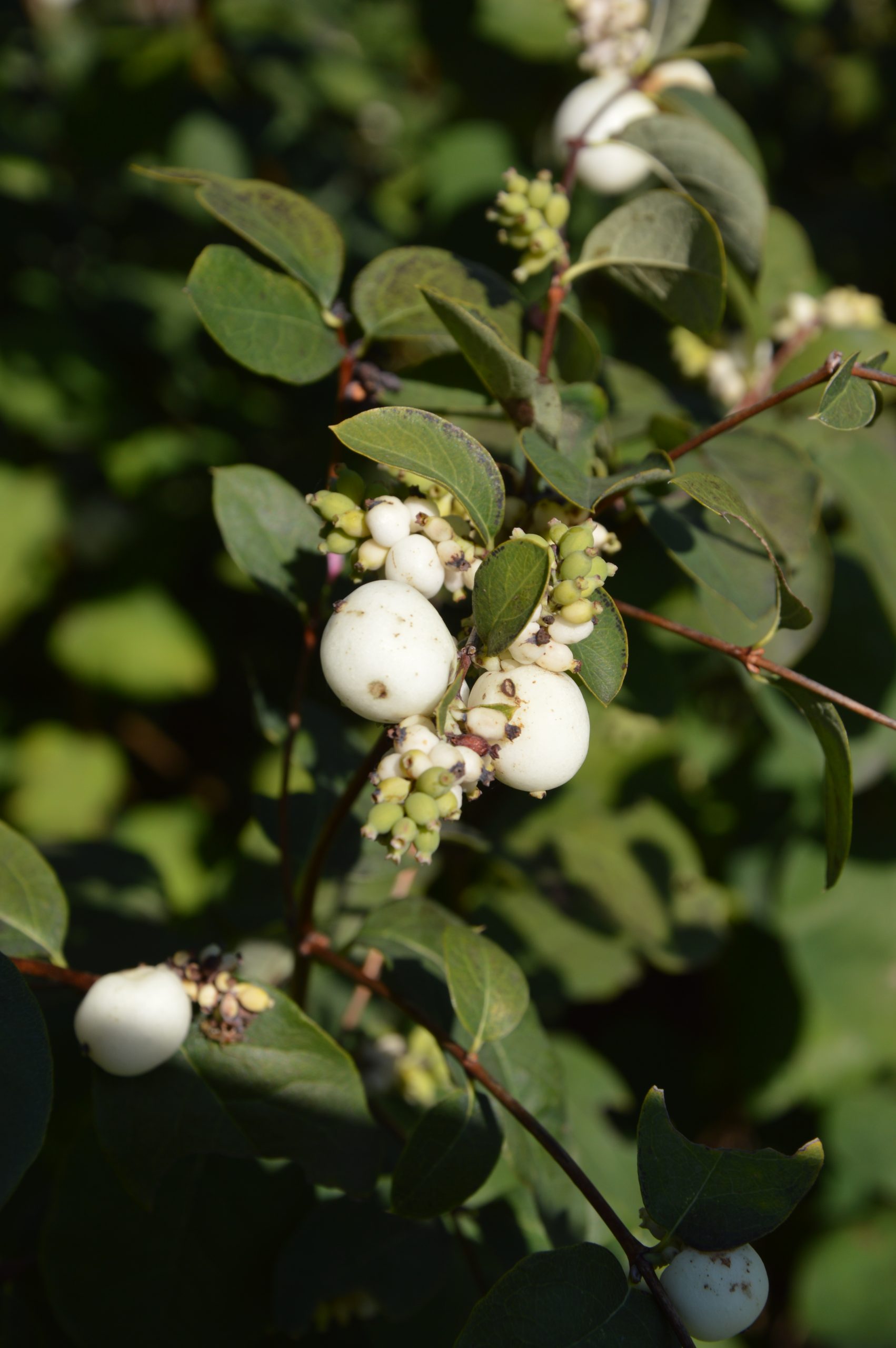 Květ, plod: Kvete od června do srpna bílo-růžovými drobnými trubkovitě zvonkovitými květy, které vyrůstají v úžlabí horních listů v hroznech a produkují velké množství nektaru. Plodem jsou velké kulaté bílé bobule o průměru 1 cm, které obsahují 2 semena. Na keři vytrvávají až do zimy, kdy slouží jako potrava ptáků.