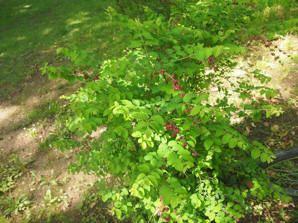 Květ, plod: Kvete od června zvonkovitými zeleno-růžovými až žluto-bílými květy uspořádanými v hroznu. Plodem jsou tmavě růžové kulaté až eliptické bobule o průměru 6 mm.