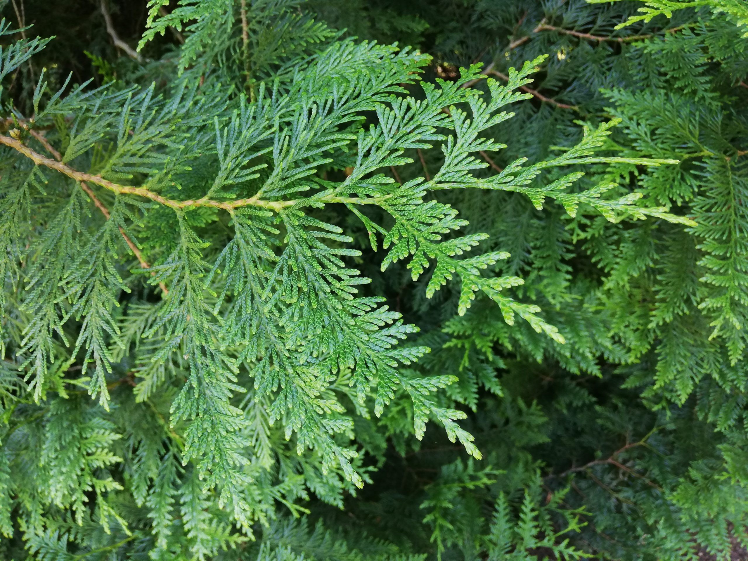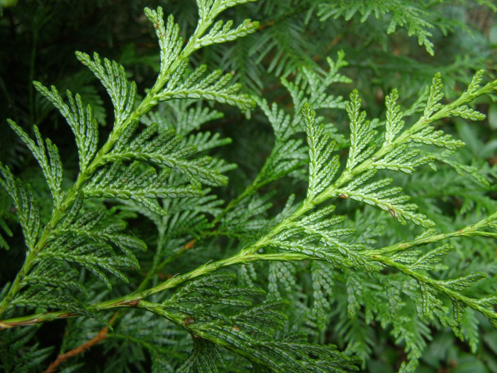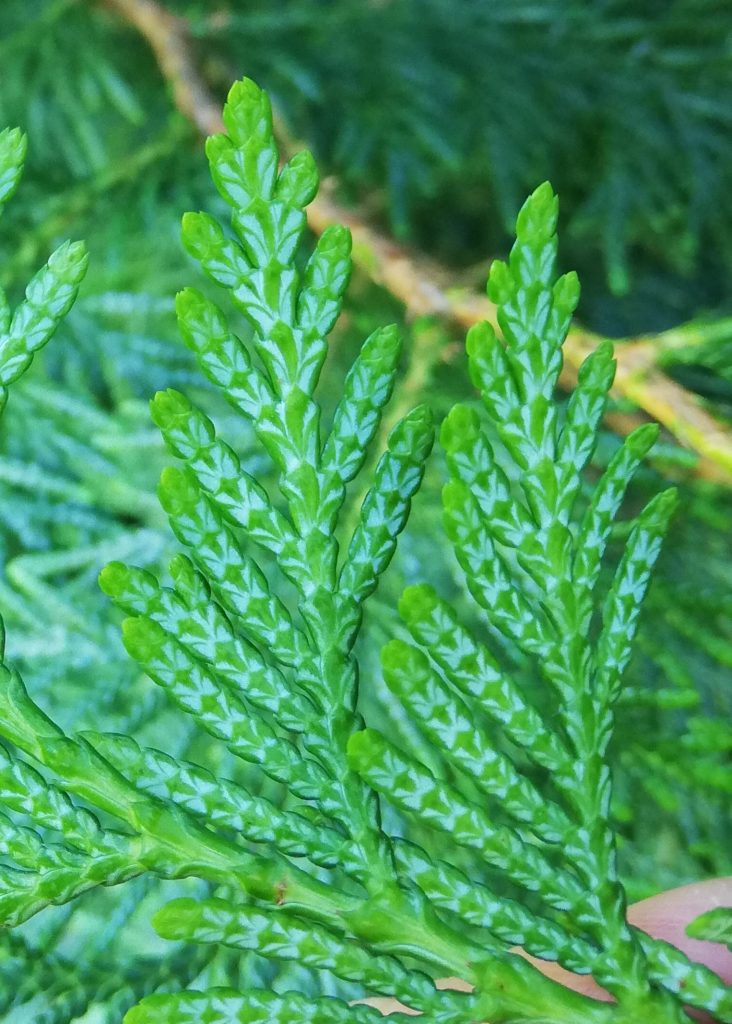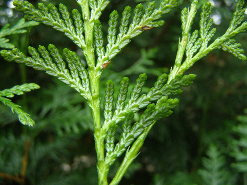 List: Juvenilní listy jsou jehlicovité. Dospělé šupinovité a křižmostojné listy jsou na vrcholu zašpičatělé. Lícová strana je lesklá, tmavě zelená. Rubová má výraznou bílou kresbu. Na starších větvích listy hnědnou.