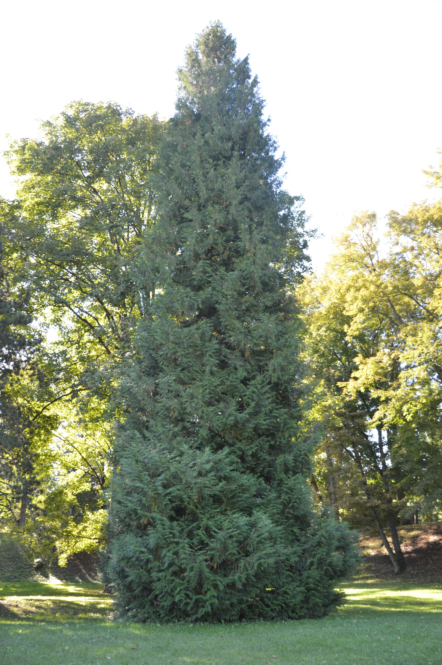 Habitus: Strom dorůstající do výšky 30–60 m s úzkou korunou a odstálými větvemi. Borka je červeno-hnědá, jemná, odlupuje se v dlouhých pruzích.